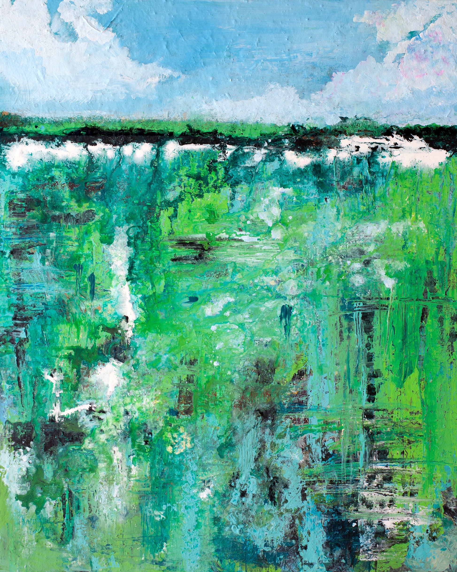 Painting has colors of vibrant green, turquoise blue, sky blue, black and white and a touch of pink. An interpretation of a meadow with trees along the horizon with a few puffy clouds on a sunny day. Can you imagine yourself being here watching the clouds roll by on a warm Spring day as the remnants of winter snow melt away?