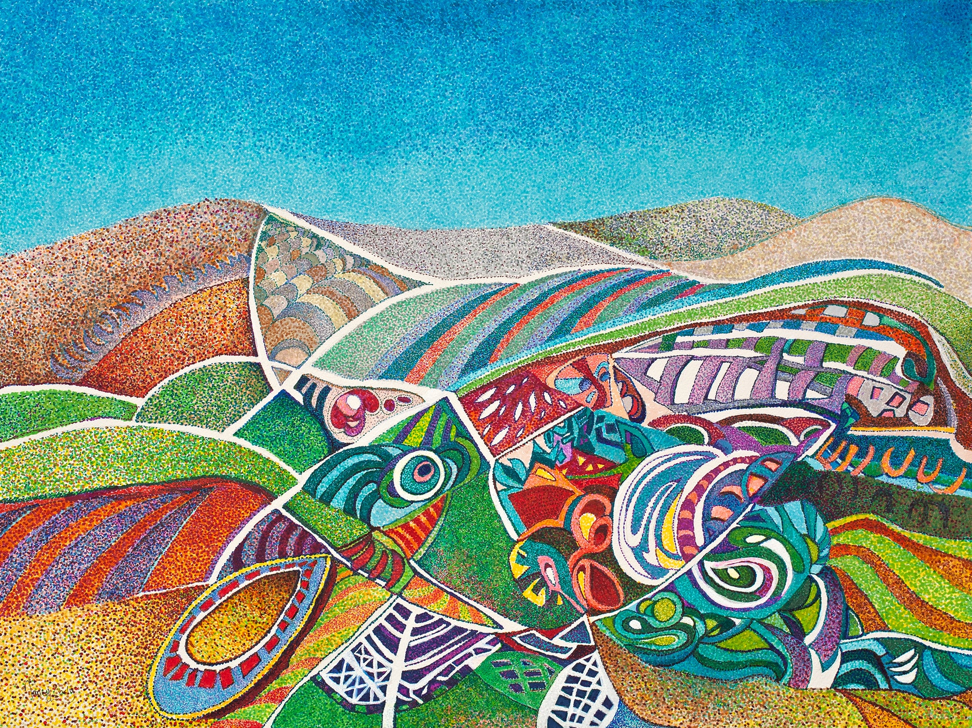 A whimsical painting of striped hills and organic shapes. Fantastic trees and fences run across the painting with a bright blue sky in the background.