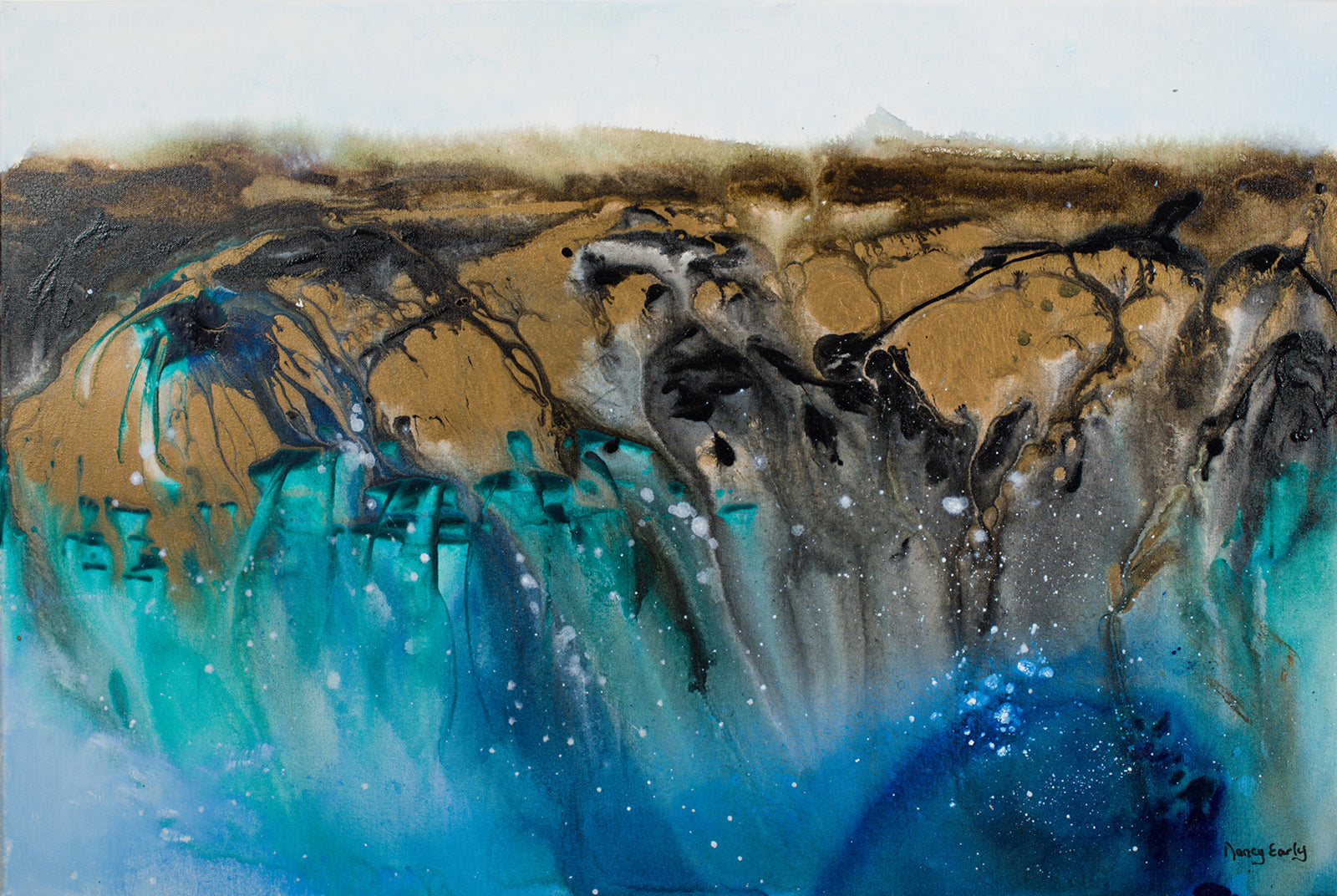 The movement and soft edges of this painting feel like sand moving across an island landscape dissolving into tropical azure waters.